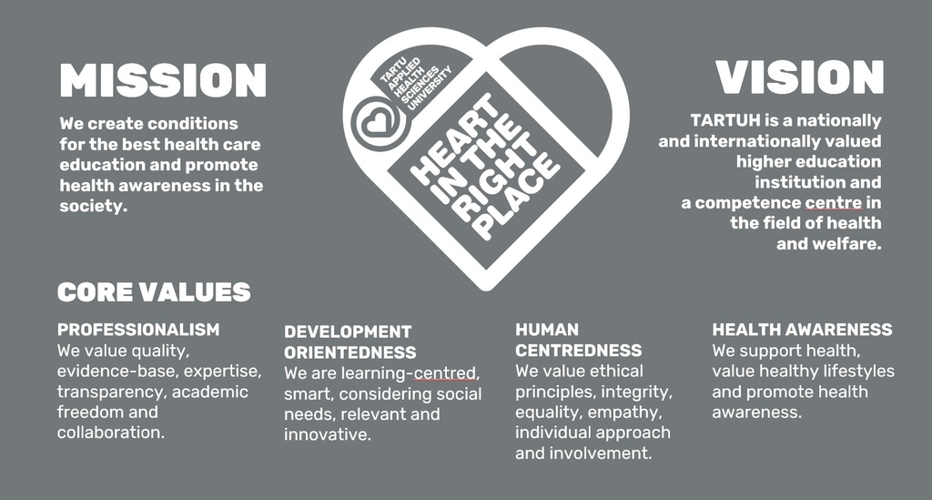 The Council recognises Tartu Applied Health Sciences University for its activities as a health promoter and leader of healthy behaviour in society, as well as for the involvement of learners in different types of community activities. The university is having a leading role in the development of new study programmes and professional standards in the field of health care. An individual approach to each learner is implemented in the study process. Stakeholder satisfaction with the university activities is high; high satisfaction is also reflected in the performance of dedicated lecturers and administrative staff. The university has thoroughly planned the activities for introducing specialities trained at the university.