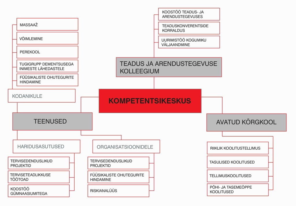 - Pakkuda elanikkonnale kvaliteetset teenust ja nõustamist, et tõsta nende teadlikkust tervisedendusest, võimalikest terviseprobleemidest ning nende ennetamisest. Kompetentsikeskus pakub erinevaid teenuseid läbi üliõpilaste praktilise tegevuse, mis on õppekava järgi erinevates õppeainetes ette nähtud. Kõrgkool lähtub oma tegevuses kvaliteedikäsiraamatust, mis on kõrgkooli kvaliteedisüsteemi kirjeldavaks põhidokumendiks ning, mille koostamise aluseks on EFQM – Euroopa Kvaliteediauhinna mudel. Kõikidele teenustele toimub registreerumine ja üldprotsess järgmiselt: